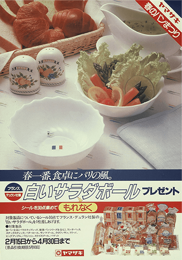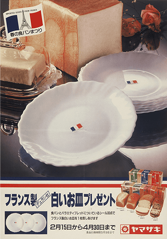 第1回は、1981年「春の食パンまつり」として実施。現在では、対象商品約500品ほどにまで広がっているパンまつりですが、当時は「食パン」のみでした。景品にはパン食文化の本場であるフランスのデュラン社製(現在はアルク・フランス社)の白いお皿を採用。清潔感とスマートさにあふれた、大変おしゃれなお皿としてご好評いただき、以降、継続してフランス製の“白いお皿”を景品としています。