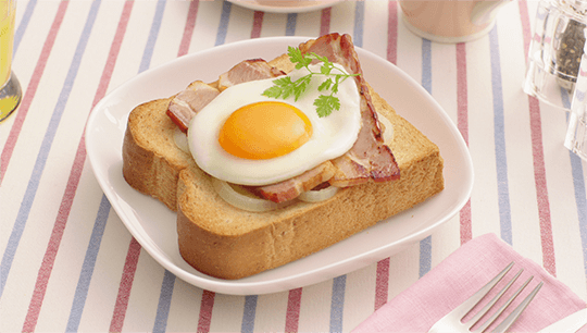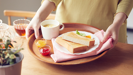 白いモーニング皿は、ちょうどサンドイッチ一人前がきれいに盛り付けられるジャストサイズ。使い方いろいろ、モーニング皿に盛りつけられる朝食メニューで、豊かな朝食をご提案しました。