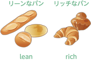 パンの分類法はいろいろありますが、「リーンなパン」と「リッチなパン」という分け方があります。リーンとは「簡素な」「脂肪のない」という意味で、リーンなパンといえば、主原料である小麦粉、水、パン酵母、塩だけでつくるパンをさします。一方リッチなパンというのは「豊富な」「こくのある」という意味であり、リッチなパンとは、卵や油脂、砂糖、乳製品などの副原料を生地に練りこんで焼いたパンのことをさします。一般に、フランスパンなどの食事パンは、料理との相性がよいようにリーンな配合になっており、こうばしい香りや風味がよいのが特長で、リッチな配合のパンは、副原料の効果で甘く、柔らかく、ふっくらとしていることが特長です。