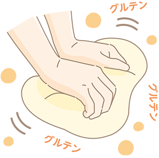 パンづくりに欠かせないのが、生地を捏ねる工程です。これは、小麦粉のたんぱく質から「グルテン」をつくり出すために行う作業です。「グルテン」とは、小麦粉を水と捏ね合わせることによってつくられる(形成される)網目構造の物質でパンのふわっとしたおいしい食感をつくるもとになるものです。捏ねることによってグルテンができるのは、他の穀物にはない小麦粉だけの性質です。