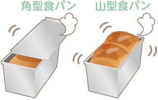 食パンは、金属製の「型」の中に生地を入れて焼きます。型にはフタつきのものとフタなしのものがあり、フタなしの型で焼いたのが山型の食パン、フタつきの型で焼いたのが角型の食パンです。パン生地は、焼いているあいだも膨張するため、フタのない型ではパン生地が上へとふくらんで山型になりますが、フタつきの型では、パン生地は上へとふくらむことができず、全部の面が型に押しつけられて角型になります。