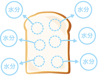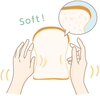 食パンのまん中の白い部分をクラムといいます。クラムをよく見ると、細かいたくさんの気泡でできていることがわかります。この気泡は、小麦粉に水を加えて捏ねることによってできる「グルテン」という小麦粉特有のたんぱく質の中に、捏ねる時に一緒に取り込まれた空気やパン酵母が生成した炭酸ガスが分散してつくられます。食パンでは、この気泡は、非常に細かく均一ですが、フランスパンでは不均一で全体に大きめであるなど、パンの種類により特徴があります。これは原料やつくり方の違いによるものです。 (CHAPTER2「パンが膨らむのはなぜ?」参照) 食パンの細かい気泡の中には、パンの味や香り、旨みが閉じ込められており、また、パンらしいソフトな歯ざわりを生んでいます。