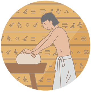 小麦を粉にして水で溶き、薄くのばして焼く画期的な手法が編み出されたのは、紀元前6000~4000年頃のこと。その舞台となったのは、古代エジプト。肥沃なデルタ地帯を持つエジプトでは、メソポタミアから伝わった小麦栽培が盛んに行われ、無発酵パンが食べられていましたが、ある時、焼き上げる前のパン生地を放っておいたところ暑い気候が自然に発酵を導き、古代エジプト人は偶然にも発酵パンのおいしさを知ることとなったと言われています。それからの発展は急速に進み、紀元前2500年頃には200種類ものパンがあったと記録されています。(「パンの歴史館」参照)