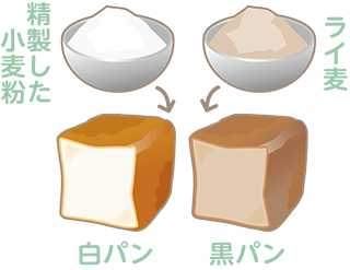 パンの色は主に、原料の麦の種類によって違っています。白パンは精製した小麦粉からつくられ、黒パンはライ麦粉からつくられます。小麦粉のパンは、古くからイギリス、フランス、アメリカ、イタリアなどの国で好まれてきました。一方、ドイツやオーストリア、ベルギー、オランダなどの寒い地方では、小麦は育たないため、寒冷地に適したライ麦の粉でパンをつくりました。小麦粉のパンが軽い食感であるのに対し、乳酸菌で発酵させるライ麦粉のパンは、独特の酸味のある重い食感が特徴です。
