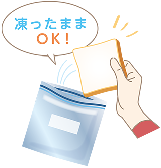 また、冷凍室から取り出してすぐにトーストしても、おいしく食べることができます。焼き方は、常温のパンと同じように、高温で短時間に焼き上げるのがコツ。トースターやオーブントースター、グリルなどパンを焼く機械は、あらかじめ温めておくことをお忘れなく。焼く時間は常温のパンより少し長めですが、表面がこんがりキツネ色になっていれば、中までちゃんと焼けたしるしです。