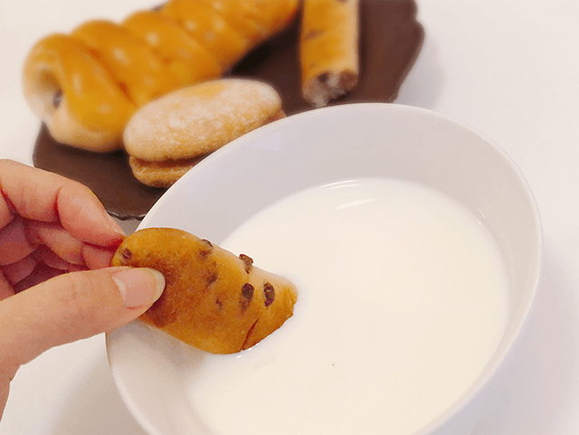 少し深めのカフェオレボウルに熱々に温めたミルクを注ぎ、菓子パンを少しずつ浸して食べれば、トロッといつもと違った食感が楽しめるだけでなく、ミルクにチョコやコーヒークリームが溶け出していき、最後はカフェオレボウルの中のミルクもほんのり甘い味わいに!