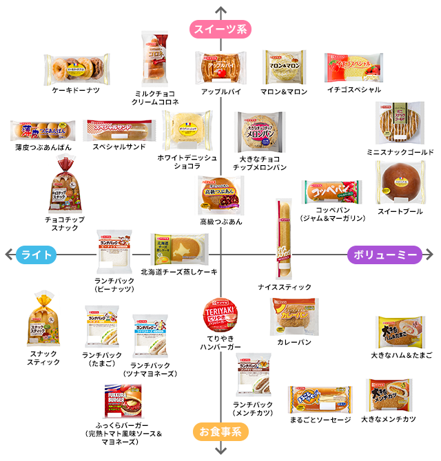 左上の「ライト」軸と「スイーツ系」軸に挟まれた部分には、「ホワイトデニッシュショコラ」など軽い生地の菓子パンを中心に、「薄皮つぶあんぱん」や「チョコチップスナック」など小ぶりなサイズが複数個入ったパックタイプが位置し、ちょっと甘いものをつまみたい息抜き用に最適です。