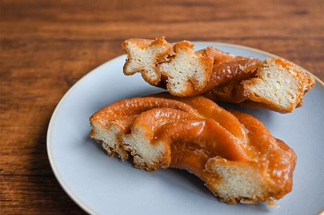 「ローズネットクッキー」は生地をフライヤーで揚げた後、最後のひと工夫があります。それが、表面のコーティング。生地にアイシングを薄くまぶすことで、砂糖のシャリシャリとした食感が加わり、よりおいしく仕上がります。このようにして、人気の食感が誕生しました。