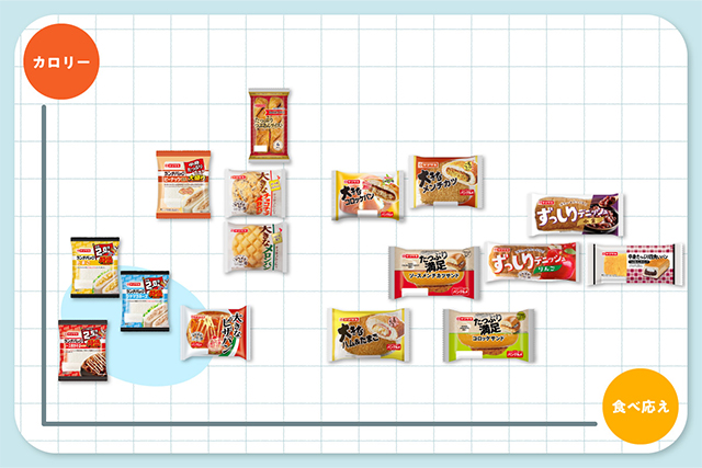 縦軸は商品をカロリーで比較しており、下側ほど控えめカロリー、上側ほど贅沢カロリーに。また、横軸は商品の食べ応えを比較しており、右側ほどずっしり、左側ほどペロリと食べられる商品を並べています。