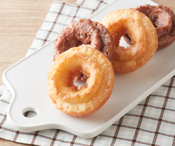 口どけのよさとしっとりとした食感にこだわったオールドファッションタイプのドーナツです。程よい甘さの味わいはティータイムにぴったりです。プレーンとココア、2つの味をお楽しみいただけます。