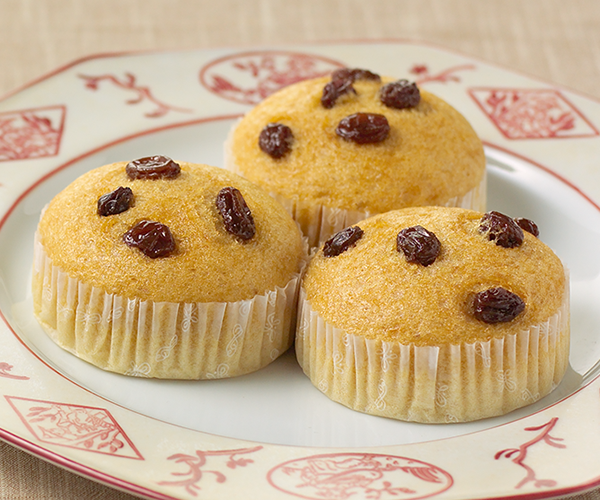 中国の茶楼(レストラン)で、デザート菓子として食されている蒸しカステラです。かくし味の醤油を加えた独特の風味の生地に、レーズンをトッピングしました。