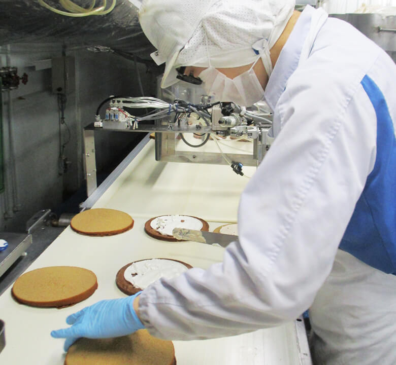 当社主力製品であるイチゴスペシャルやアーモンドスペシャル等のスペシャルシリーズやレーズンサンドと言った製品のクリーム作りやラインでの生地の重ね作業を日々行っています。