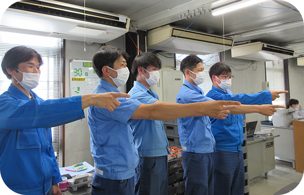終礼ではその日の業務内容を全員で共有し、指差呼称で安全意識を高めて一日を終えます。