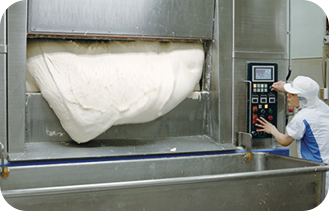 「パンのでき具合は、『生地』の良し悪しで決まる!」と言われるほど、パン生地の「仕込み」は重要な工程です。小麦粉や水、パン酵母といった原材料を正確な計量によって混ぜ合わせ、厳重な温度管理のもとでおいしいパンの源が作られています。