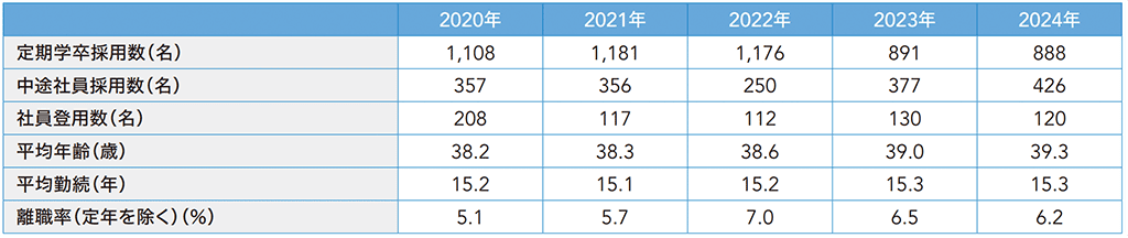 社会的に人手不足が課題となっていますが、当社においては、各部門の将来の役職候補およびリーダー候補として、定期学卒者を一定数安定的に採用するとともに、18歳人口の減少や転職市場の活性化等昨今の採用環境の変化に対応し、中途採用を強化しています。