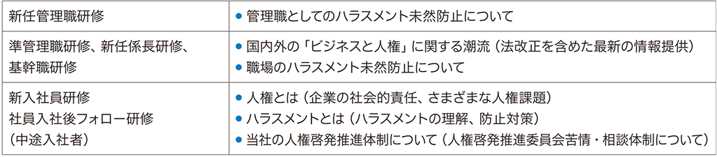 新任管理職研修、準管理職研修、新任係長研修、基幹職研修、新入社員フォロー研修(2年目・3年目)、社員入社後フォロー研修(中途入社者)など各階層別の研修において人権啓発に取り組んでいます。