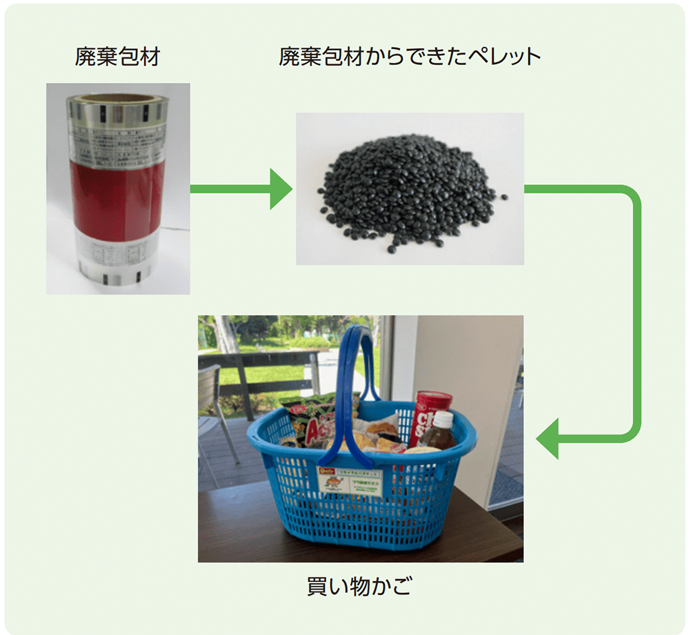 商品の改廃等で製造工場からやむなく発生する廃棄包材のリサイクルを推進しています。処理先のプラスチック再生業者の協力のもと、デイリーヤマザキの買い物かごとして再生加工し、川崎池上新町3丁目店で使用しています。