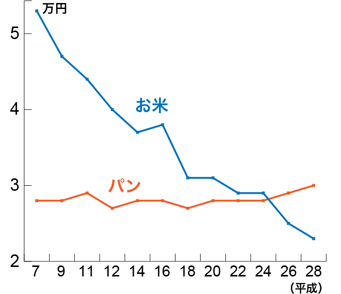 総務省が行なった家計調査の結果によると、平成22年にパン類の購入金額はお米と肩を並べるまでになりました。その翌年には初めてパン類がお米の購入金額を上回り、近年ではその差は大きなものとなりました。また、阪神大震災、東日本大震災では火を通さずに食べられる衛生的な食品として大変喜ばれました。平常時、緊急時を問わず、パン類は今や国民の主食として定着し、国民にとって必要不可欠な食品となっています。