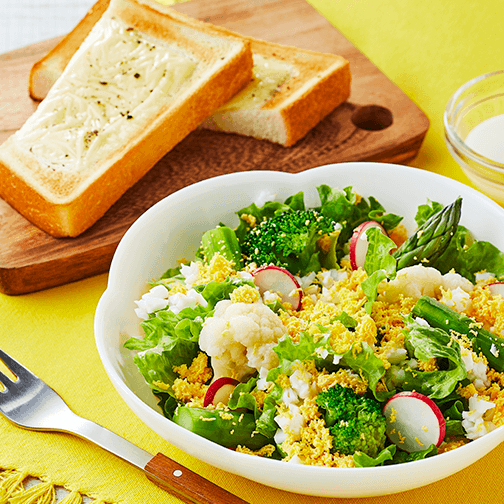 パンとサラダはお友だちであり、サラダはパンの美味しさを引き立てる名パートナーというコンセプトから、白いお皿にサラダボールを選定。楽しく、健康的な食卓を、という願いをこめてお届けする春一番のプレゼントでした。