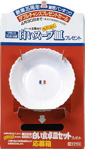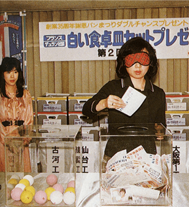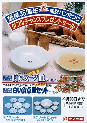 第3回目となる1983年は、山崎製パン創業35周年を記念して「創業35周年謝恩パンまつりダブルチャンスプレゼントセール」として実施し、白いスープ皿をプレゼント。日頃のご愛顧への感謝を込めて、この年にはじめて、お皿をもらった人に更に抽選で景品があたる”ダブルチャンス”を実施。このダブルチャンスの抽選は、特別に設営された会場で、関係者が見守るなかお客様代表の方も参加して行われました。