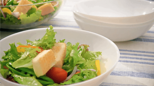 人気のボウル型。深さも大きさも使い勝手抜群の実用性の高いお皿でした。「おいしさ広がる春の食卓」をテーマに、サラダ、スープ、フルーツなど、パン食のさまざまなサイドメニューをご提案しました。