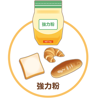 小麦粉は、含まれるたんぱく質(グルテン)の量によって、大きく三つの種類に分けられます。たんぱく質の多い順に、強力粉・中力粉・薄力粉の3種類です。このうち、パンには主に強力粉が使われます。強力粉はたんぱく質が多いため、弾力性に富んだおいしいパンができるのです。それぞれのタイプごとに、1等、2等、3等、末粉という等級(グレード)があり、グレードが高いほど、白くてキメの細かいパンができます。
