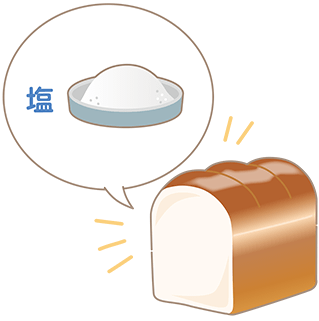 塩は、パンの原料として欠かせないものの一つです。ペストリーのような甘いパンにも、かならず塩は入っています。塩には、塩味をつけるだけではなく、隠し味として小麦本来の風味を引き出したり、甘みや風味を際立たせたりする役割があります。また、グルテンを強くしてダレやすい生地を引き締め、形の整った弾力のあるパンにしたり、雑菌の繁殖を防いだり、パン酵母の発酵を適切に調節するといった効果もあります。