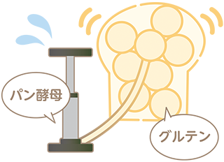 パンがふくらむ要因は二つあります。一つは、小麦粉には「グルテン」のもとになる特有のたんぱく質が存在すること、もう一つは、「パン酵母」の働きによって炭酸ガス(二酸化炭素)が発生することです。小麦粉に水を加えて捏ねることでグルテンが形成されますが、グルテンは膜状の性状をしており、その中には多数の小さな気泡が存在しています。これにパン酵母が生成する炭酸ガスが取り込まれ、気泡が融合することなく大きくなることで生地は膨らみます。グルテンはたんぱく質なので、卵や肉と同様、焼くことによって固くなり、パンの骨格を形成します。発酵によってパン生地がふくらみ、焼くことによりふっくらとしたパンができます。