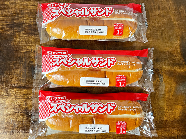 「スペシャルサンド」をはじめとした姉妹商品はすべて、上面に縦に切り込みを入れてクリームが見えやすいようにサンドしています。