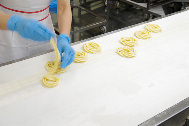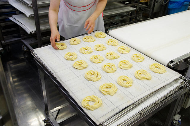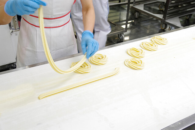まずは、「ローズネットクッキー」の元となる生地を混ぜ合わせて機械で棒状に絞り出した後、規定の長さにカットします。