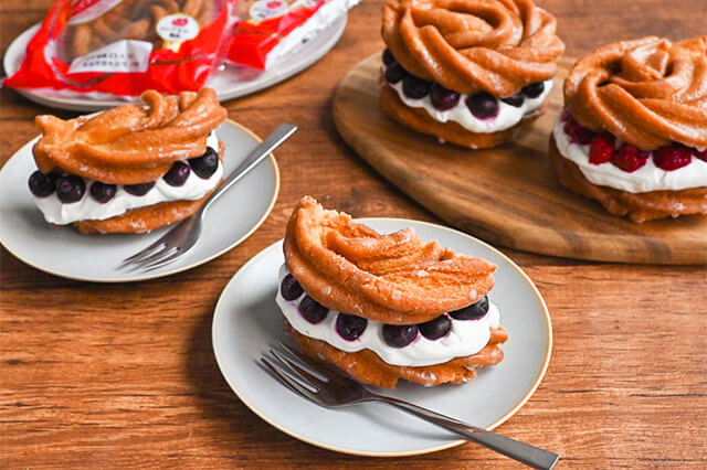 「ローズネットクッキー」にお好みのクリーム、冷凍フルーツ、ミックスナッツなどをトッピングし、もうひとつの「ローズネットクッキー」を上にのせれば完成!