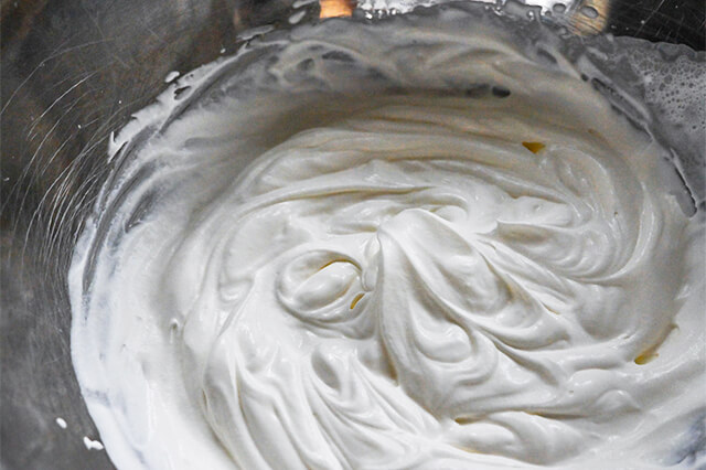 ①ボウルに生クリーム、砂糖を入れて泡立て器で8分立てまで泡立てます。水切りヨーグルトを入れ、なめらかになるまで混ぜます。