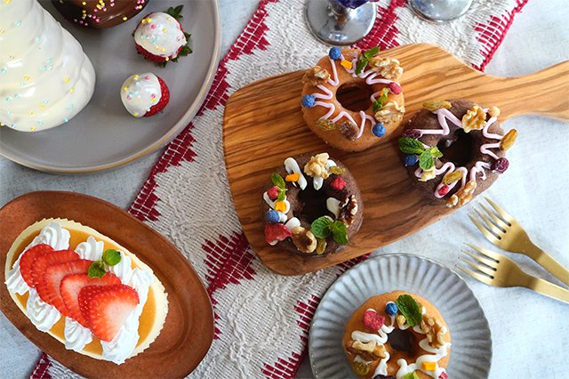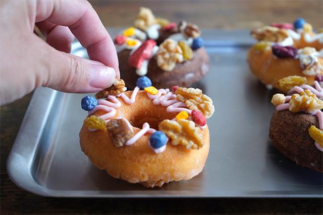 「ケーキドーナツ」はクリスマスのリースに見立ててデコレーション。「ケーキドーナツ」にチョコペンでラインを入れたら、ナッツやドライフルーツ、ハーブなどを使って、飾りつけます。