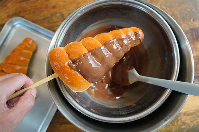 「ミルクチョコクリームコロネ」にお箸を刺してチョコレートをかけると、塗りやすいですよ。「ミルクチョコクリームコロネ」は先端にも穴があいているので、お箸を貫通させてボウルにかけておくと、そのまま冷やすことができます。