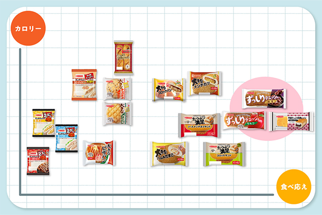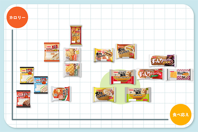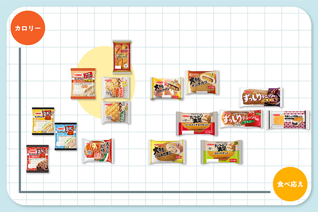 縦軸は商品をカロリーで比較しており、下側ほど控えめカロリー、上側ほど贅沢カロリーに。また、横軸は商品の食べ応えを比較しており、右側ほどずっしり、左側ほどペロリと食べられる商品を並べています。