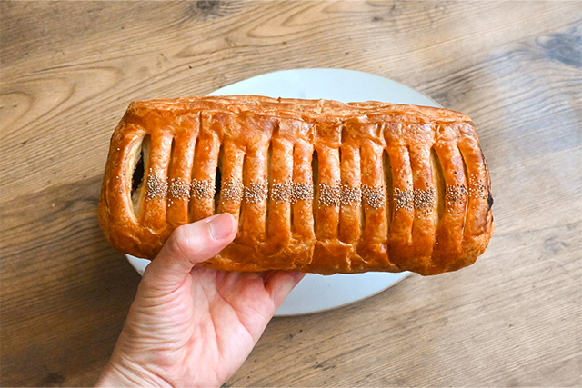 柔らかく歯切れの良いデニッシュ生地とフィリングのバランスが絶妙な「ずっしりデニッシュ」シリーズ。手の大きさと比較するとそのサイズ感が伝わるのではないでしょうか。