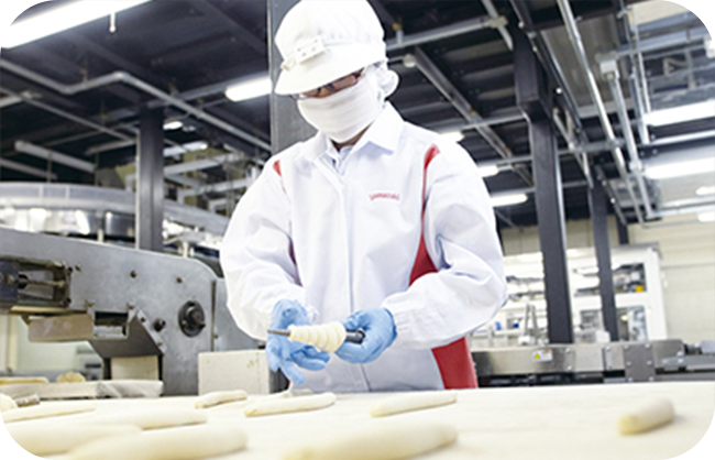 ヤマザキの生産職では、食パン・菓子パンに代表されるパン以外に、和菓子や洋菓子など様々な製品を作っています。ご紹介するのは、生産職の一員として携わるパンづくりの基本的な流れ「仕込み」「成型」「焼成」「包装」「仕分け」です。『安全』で『おいしい』製品に仕上げるため、共に働く仲間とのチームプレーによって製品を作り上げる喜びは格別です!