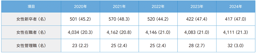 当社では、性別にかかわらず個人の能力や適性に応じた適材適所の人材配置を基本としています。女性も安心して生き生きと活躍することのできる環境を整備するため、積極的な女性の採用と役職登用を推進するとともに、結婚・出産・育児というさまざまなライフイベントの中、継続して勤務することのできる両立支援制度の拡充を図り、研修の実施や積極的な広報による制度の周知に取り組んでいます。また、当社の製品には女性消費者も多く、女性目線での積極的な製品開発にも取り組んでおり、業績の向上に寄与しています。