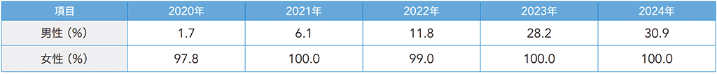 当社では、すべての従業員が仕事と育児・介護との両立を図ることができるよう各種両立支援制度を設けており、多くの従業員が制度を活用しています。男性の育児休業取得についても、ガイドブックの提供や各種研修等を通じて制度を周知し、取得率の向上に努めています。