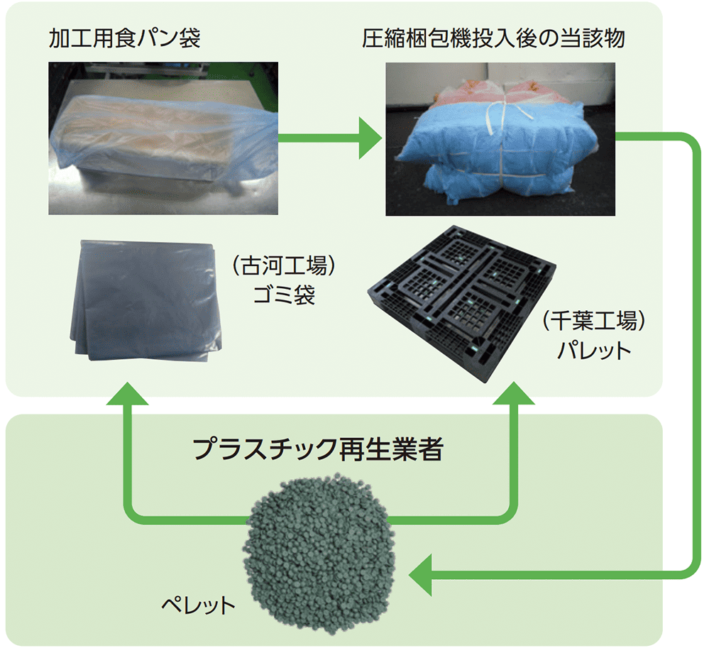 食パン加工製品を生産する過程で一時的に加工用食パン(三斤)を保管するためにプラスチック製の袋を使用しており、そのリサイクルを推進しています。処理先のプラスチック再生業者の協力のもと、古河工場ではゴミ袋に再生加工、千葉工場ではパレットに再生加工して工場で使用しています (ゴミ袋は消耗品であるため継続的に原料が必要となることから、リサイクルが円滑に進むという利点があります)。