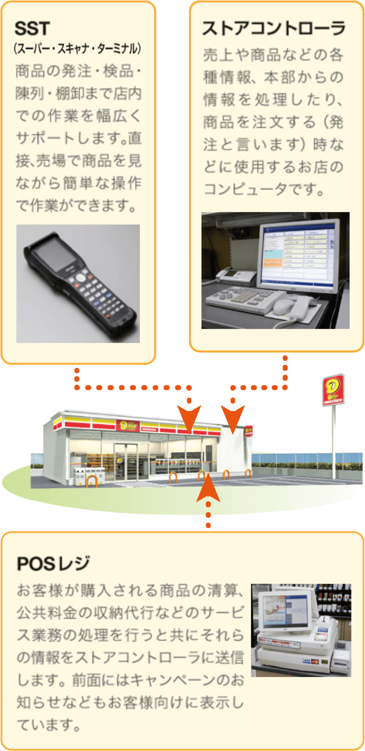 新商品情報、個々の商品の売れ行きから天候の情報などお店を経営するために必要な多くの情報を管理、処理するコンピュータネットワークシステムを構築。効率的な物流ネットワークと併せて、お店の効率化をバックアップします。