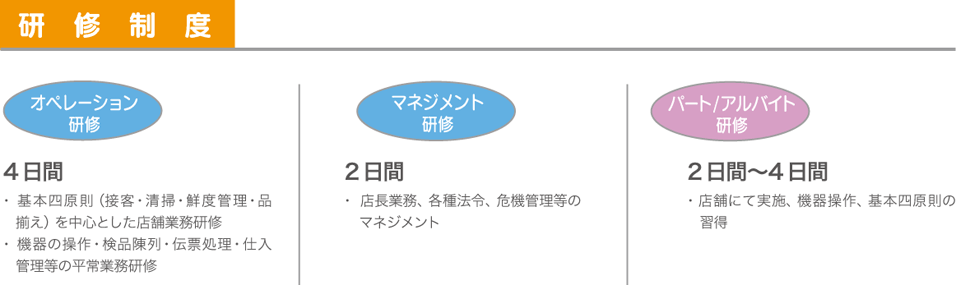開店前研修として、店舗のマネジメントとオペレーションを、理論研修と店舗実習で効率よく学んでいただきます。 また、加盟店様対象の総合展示会を、関東・関西・九州の各会場で開催しています。この展示会では、山崎製パンの新たな取り組み、新商品の展示・試食や販売促進のアイデアの提供、コンピュータを使った売上アップのための品揃え・発注の実演などを行います。情報収集の場であり、経営に役立つ研修の場でもあります。なお毎月の商品・販売情報の収集に役立つ「デイリーチャレンジ」を毎月お届けしています。